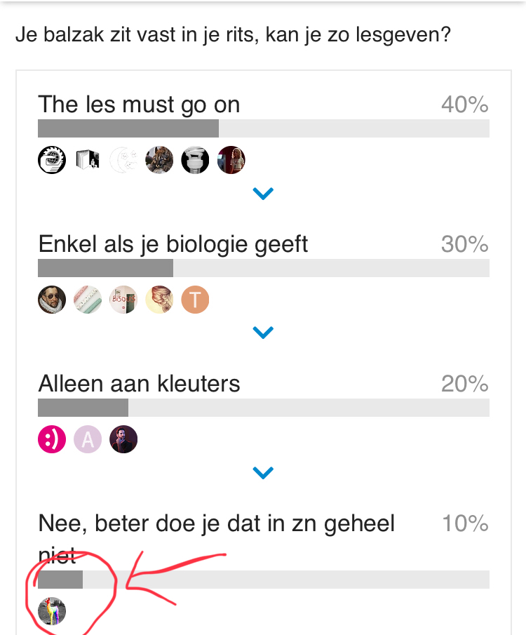@Zemraluani op jouw poll heb ik beter niet gestemd, maar vooral omdat het me heel pijnlijk lijkt voor de docent, die kan dus beter eerst zijn balzak bevrijden.