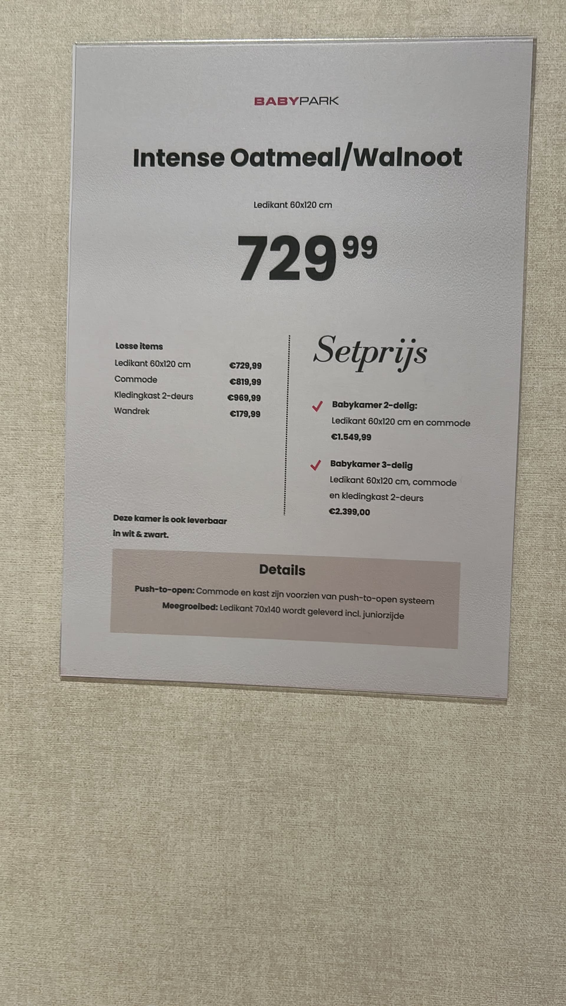 Is dat een merk? Weet niet ze hadden allerlei verschillende opstellingen die je dan kon zien. Goedkoopste set van bed en commode die ik heb gezien was 900 euro maar moet wel zeggen heb niet heel goed gekeken omdat ik dus niet op zoek was naar een kamertje. Sommige meubels waren ook wel echt mooi hoor en misschien zijn ze erg prettig in gebruik? Liep er langs en omdat ik zo langzaam loop viel m’n oog erop haha