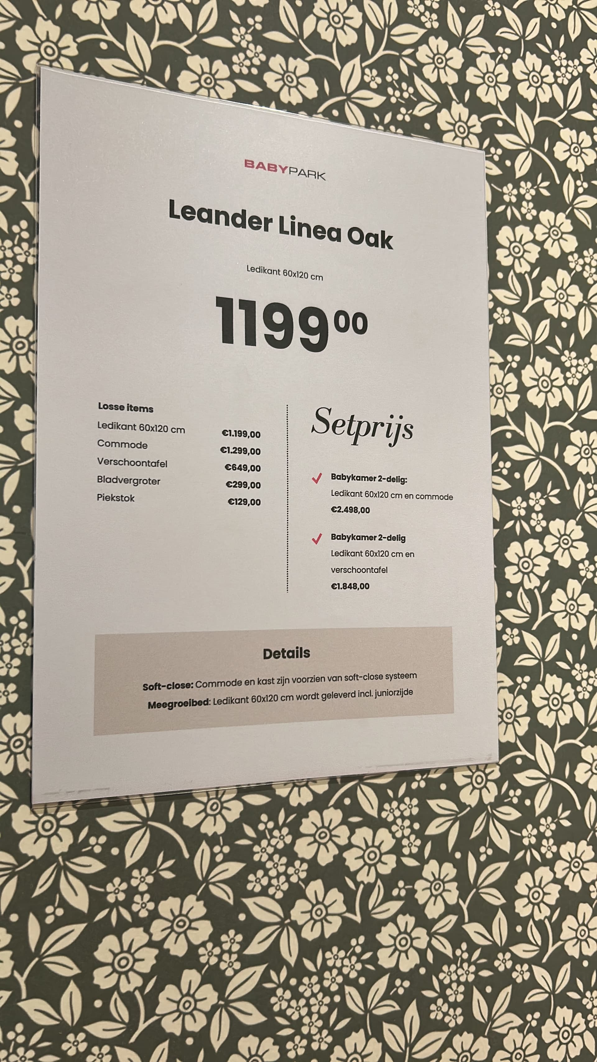 Ik was bij een hele grote babypark en een beetje verdwaald op zoek naar autostoelen en ledikantlakens, toen liep ik per ongeluk eigenlijk tussen de babykamers tot m’n oog ineens op een prijs viel… dus ik wilde dat naar m’n man sturen om te lachen zo van wow moet je kijken sommige mensen kopen een babykamer voor 700 euro!! En toen pas zag ik dat dat alleen nog maar het bed was!