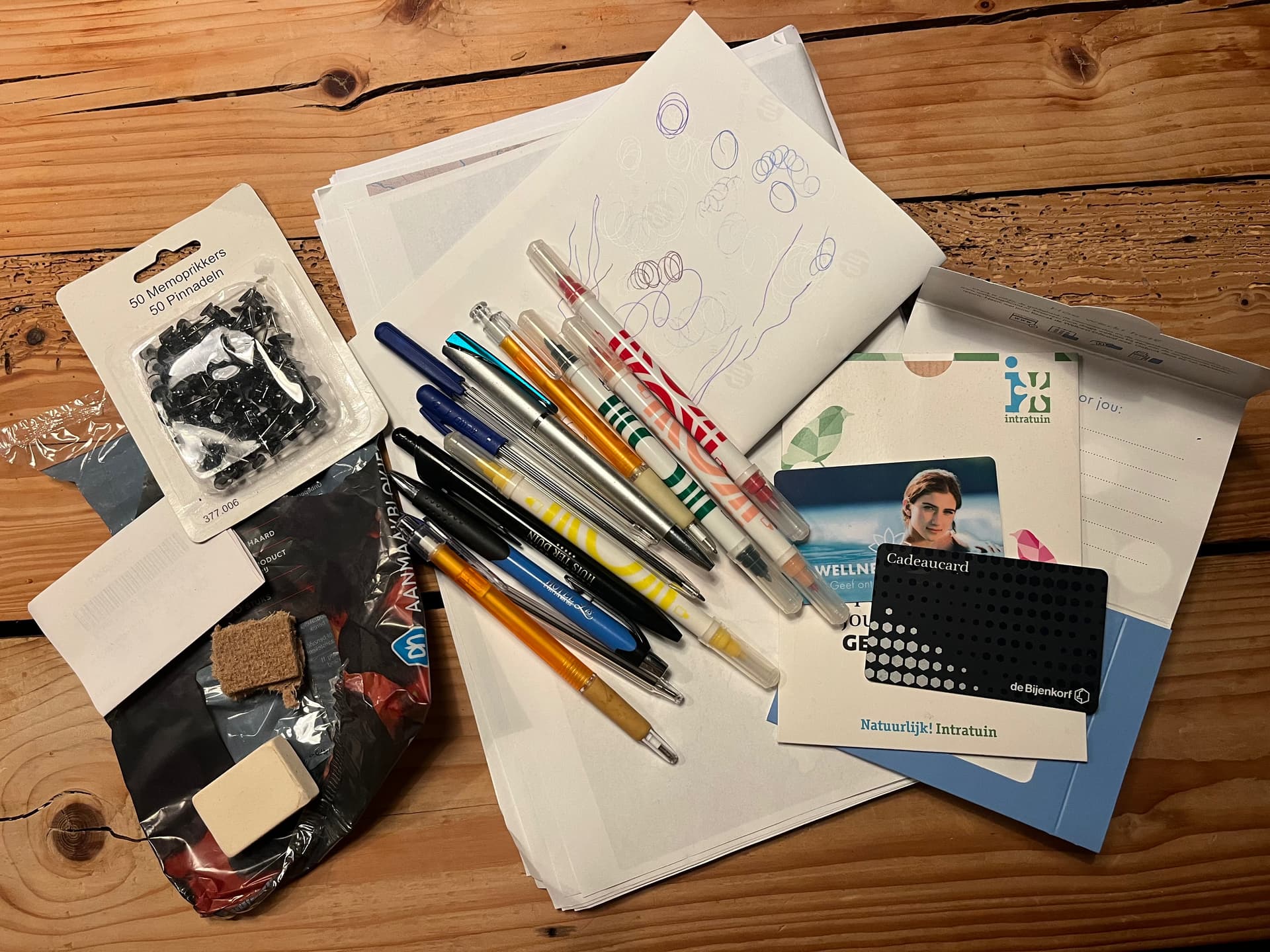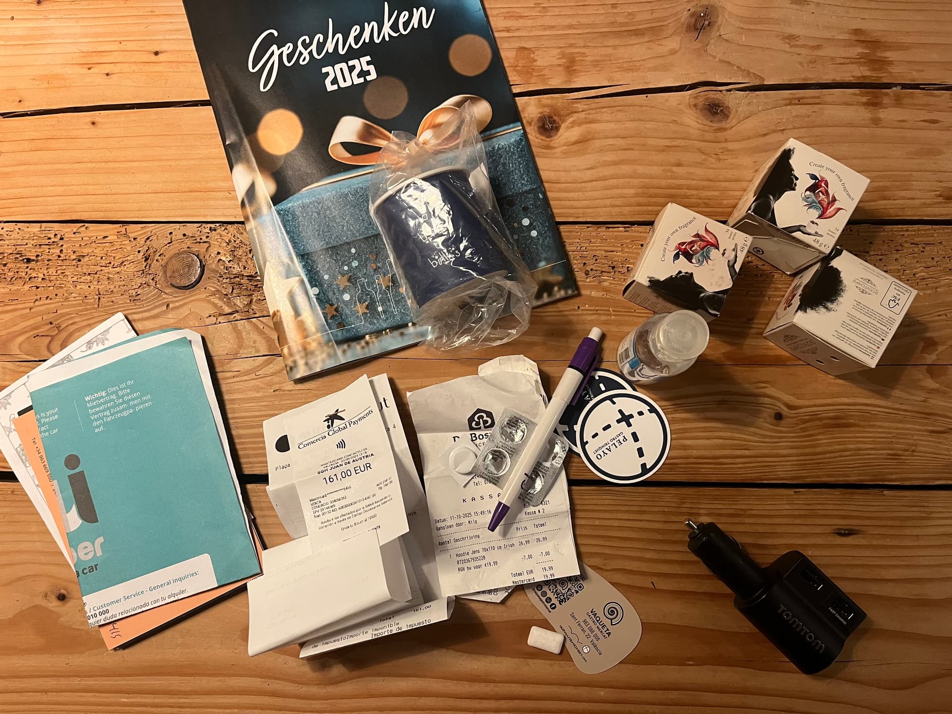 allerlei losse dingen zoals bonnetjes, kauwgom, pen, lege handgel (2 tassen opgeruimd)