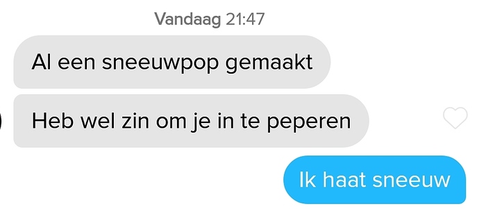 Doet me denken aan mijn allereerste tinderdate (5 jaar geleden) toen die jongen ook iets zei in de trant van ‘je bent niet echt onder de indruk van alles wat ik doe he?’ waarna ik zei nouja 't is wel geinig maar, eh, nee? Ik snapte niet waarom ik er onder de indruk van moest zijn.