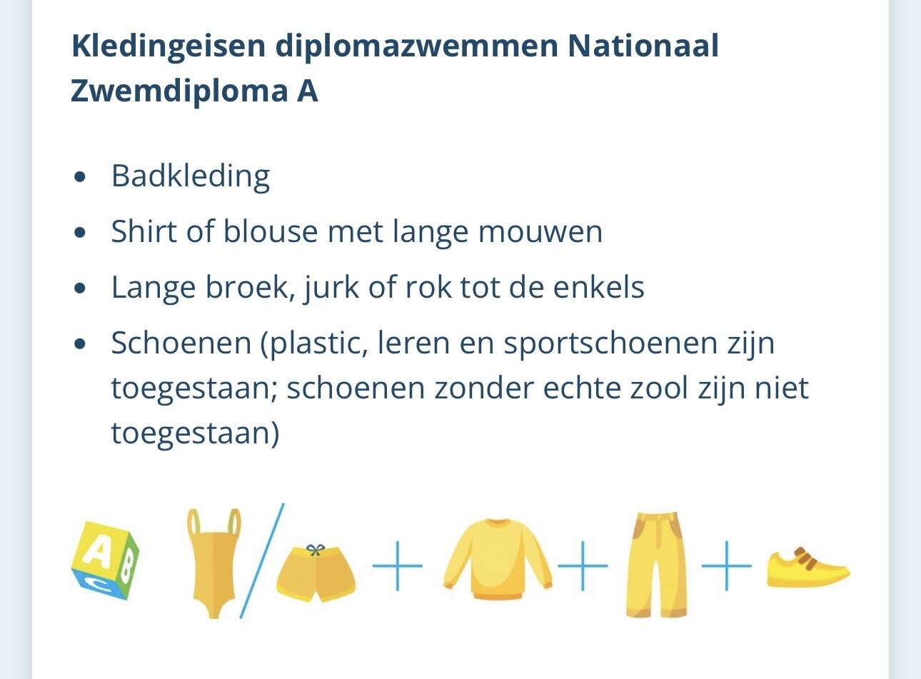 Haha, wat een bijzondere eisen. En wat verschilt dat dan, hier is A diploma een lange broek en shirt met lange mouwen (maar mag dan wel weer een dunne broek zijn).