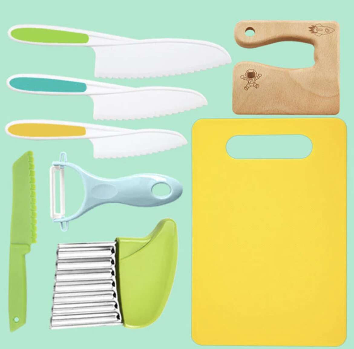 Dat groene ribbel hak-ding vind ik wel heel griezelig, dus die gebruiken we nu pas met 3,5 jaar. En die dunschiller is echt prut. Maar die witte en groene messen zijn top. Wij gebruiken de kleinste.
