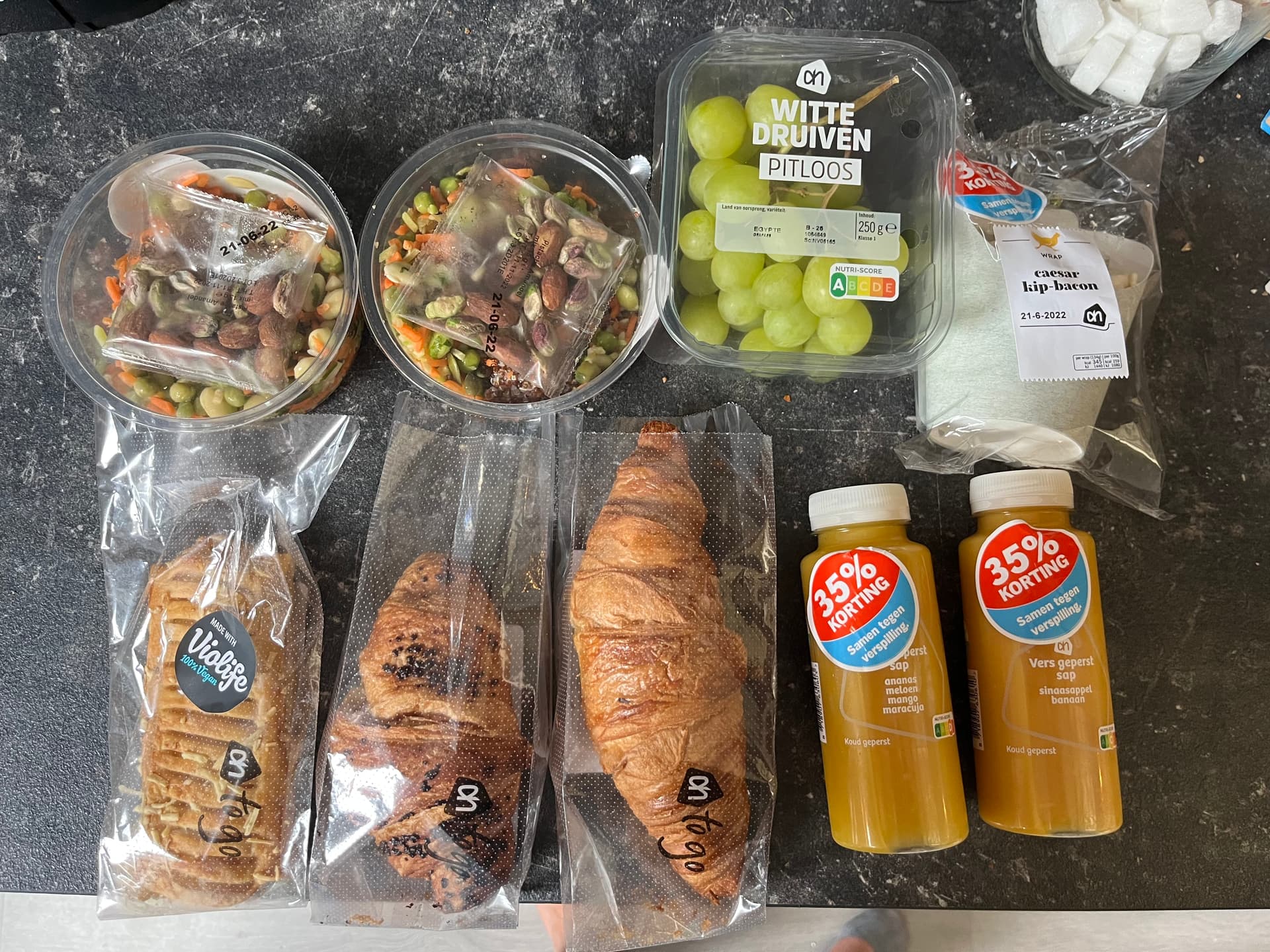 Ik vond mijn gisteren ietwat tegenvallen… 2 zakken gemengde sla, zakje rauwkost, empenadas voor in de oven/airfryer, kant en klaarmaaltijd kipsaté (mag geen pinda’s) en een portobello.