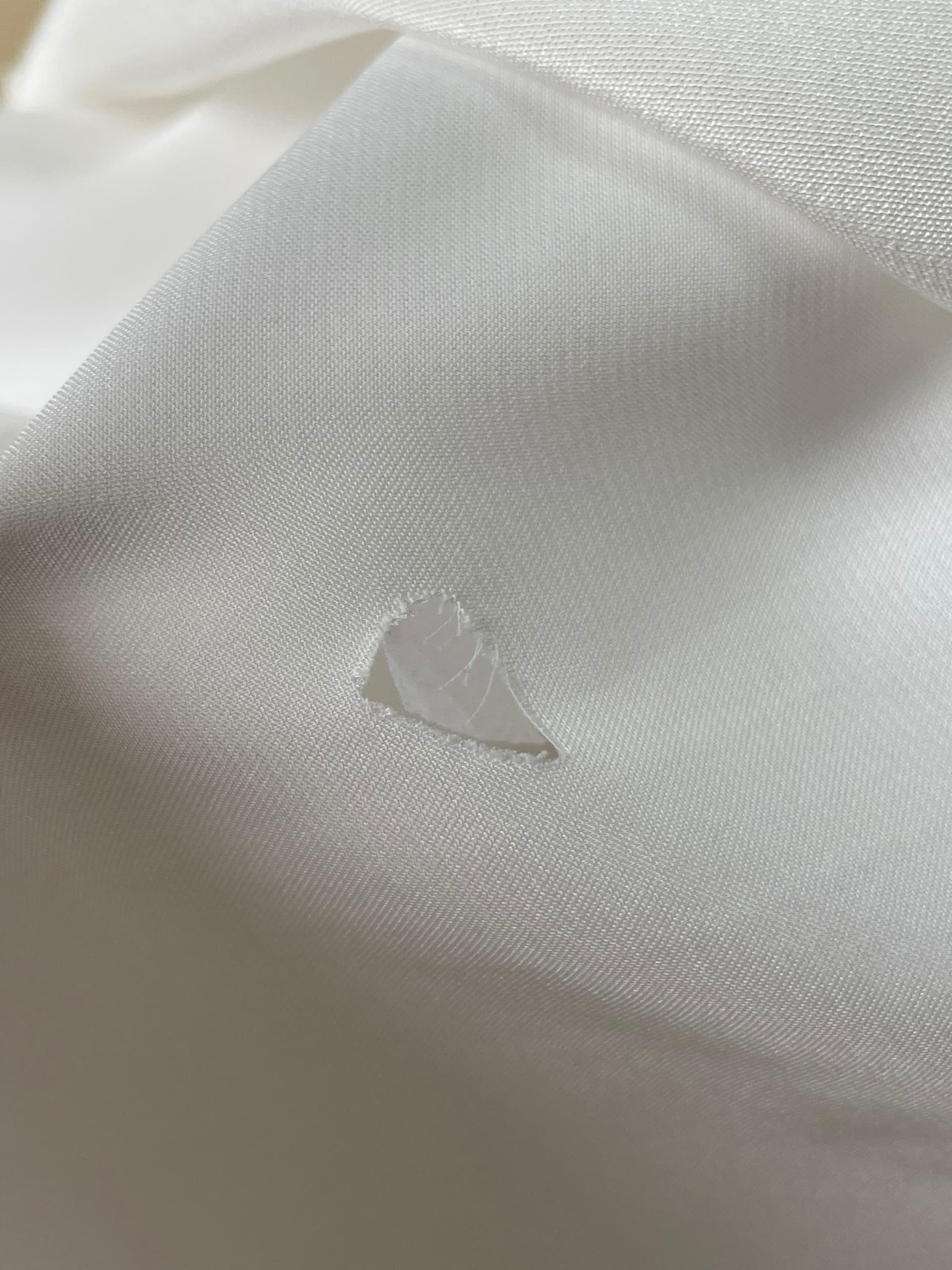 Deze externe coupeuse zegt wel dat het gat veroorzaakt is door een schaar. Dus of bij de designer of bij de coepeuse die mijn jurk heeft vermaakt.