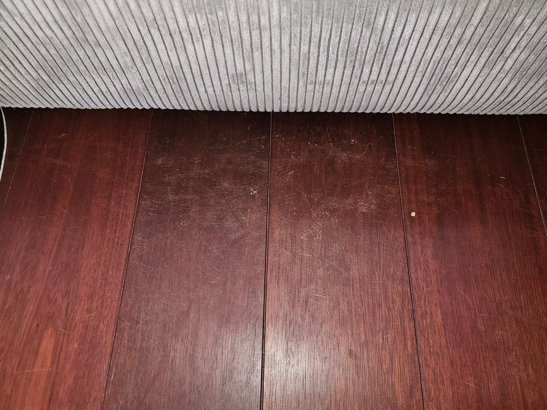 Er zitten overigens op meer plekken krassen en beschadigingen op de vloer, het is niet zo dat dit ineens op een totaal intacte vloer is verschenen, maar dit zit wel enorm in het zicht dus baal er wel echt van.