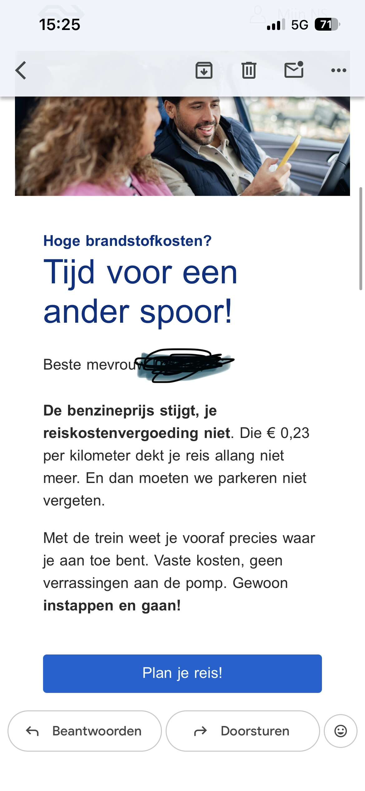 Ik ga standaard met de trein (heb niet geen auto) maar die treinpropaganda van de NS kan ik echt zo weinig mee