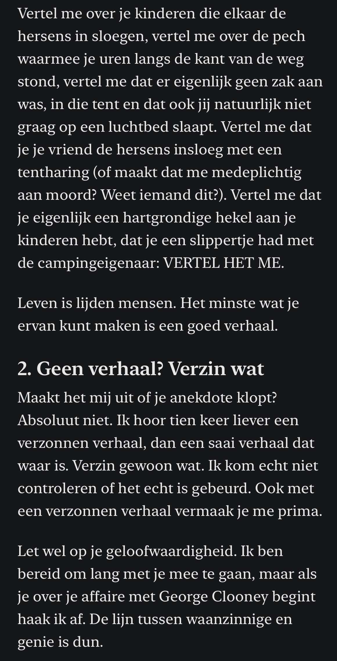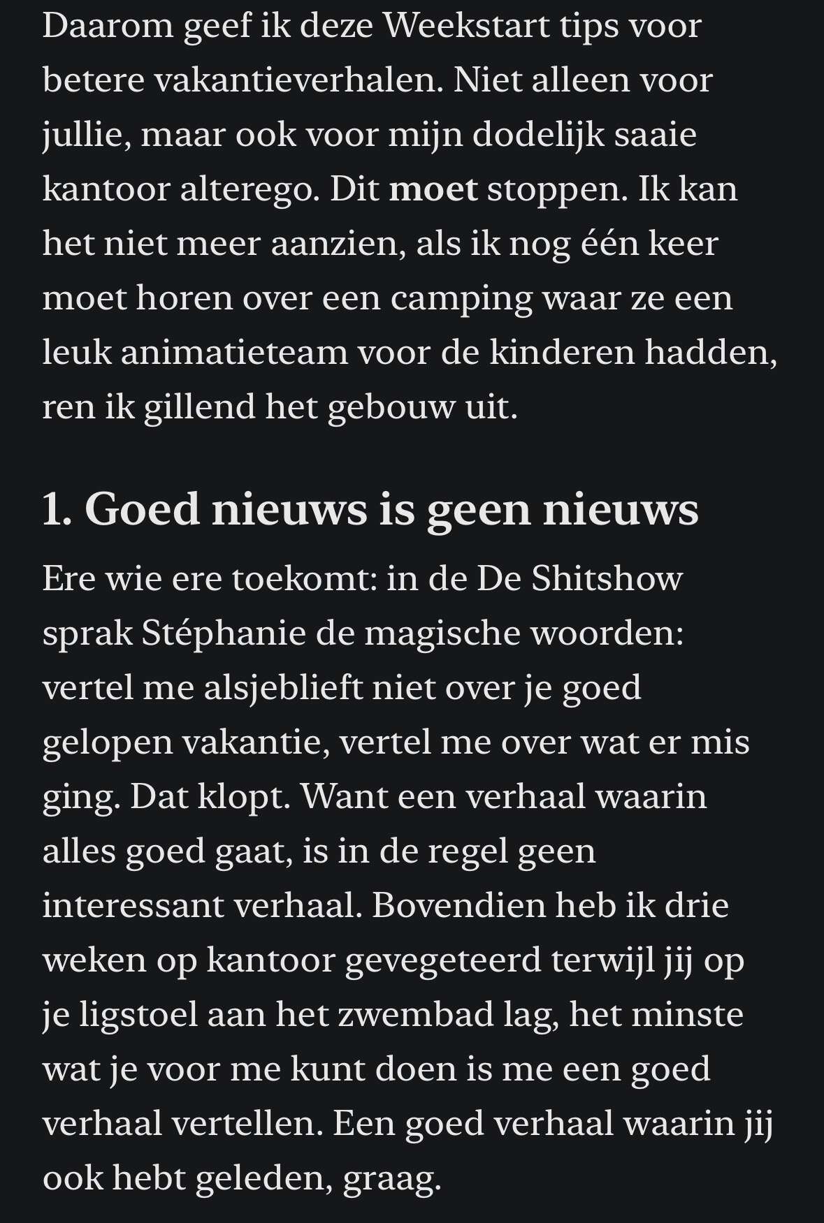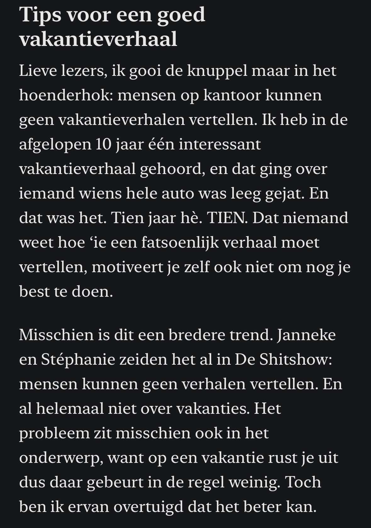 Dit ‘lekker werken of uitrusten’ geldt misschien alleen als je werkgever je een eersteklas kaart geeft en het daar niet druk is en de trein überhaupt rijdt. Is dat niet het geval, dan is het survivallen in de tweede klas, waarin je inderdaad blij bent als er een zitplek is in die spits waar je vanwege je kantooruren aan vast zit en je niet met je neus op de rugzak van iemand anders in het gangpad staat. En als je al zit, dan is dat soms met je voeten aan de vloer geplakt vanwege een leeggelopen blik drinken van iemand anders, terwijl je, ondanks je noise cancelling koptelefoon, helemaal lijp wordt van een Gerda die achter je een metalen bakje met yoghurt uitlepelt en je uit alle macht probeert geen fysiek contact te hebben met de benen van de man spreader naast je. En dan nog hopen dat je niet ergens strandt en voldoende je veters hebt gestrikt, zodat je meteen na de mededeling dat ‘deze trein helaas niet verder rijdt’ je de sprint kunt trekken naar de sprinter die nog wel rijdt (daarom heet dit boemeltje waarschijnlijk sprinter, omdat je zelf er naartoe moet rennen).