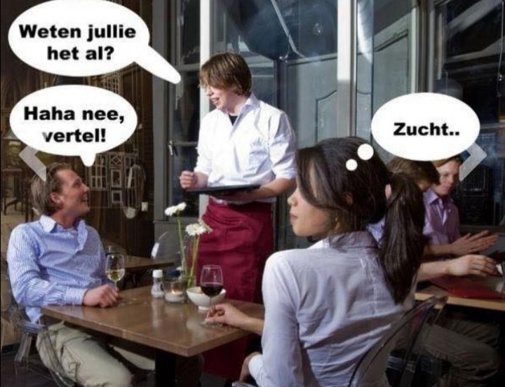 In dezelfde lijn, dat ik aan de telefoon vraag: “Ik zal even kijken of mijn collega bereikbaar is. Meneer Jansen was het, hè?” “Is het nog steeds hoor!1!11!”
