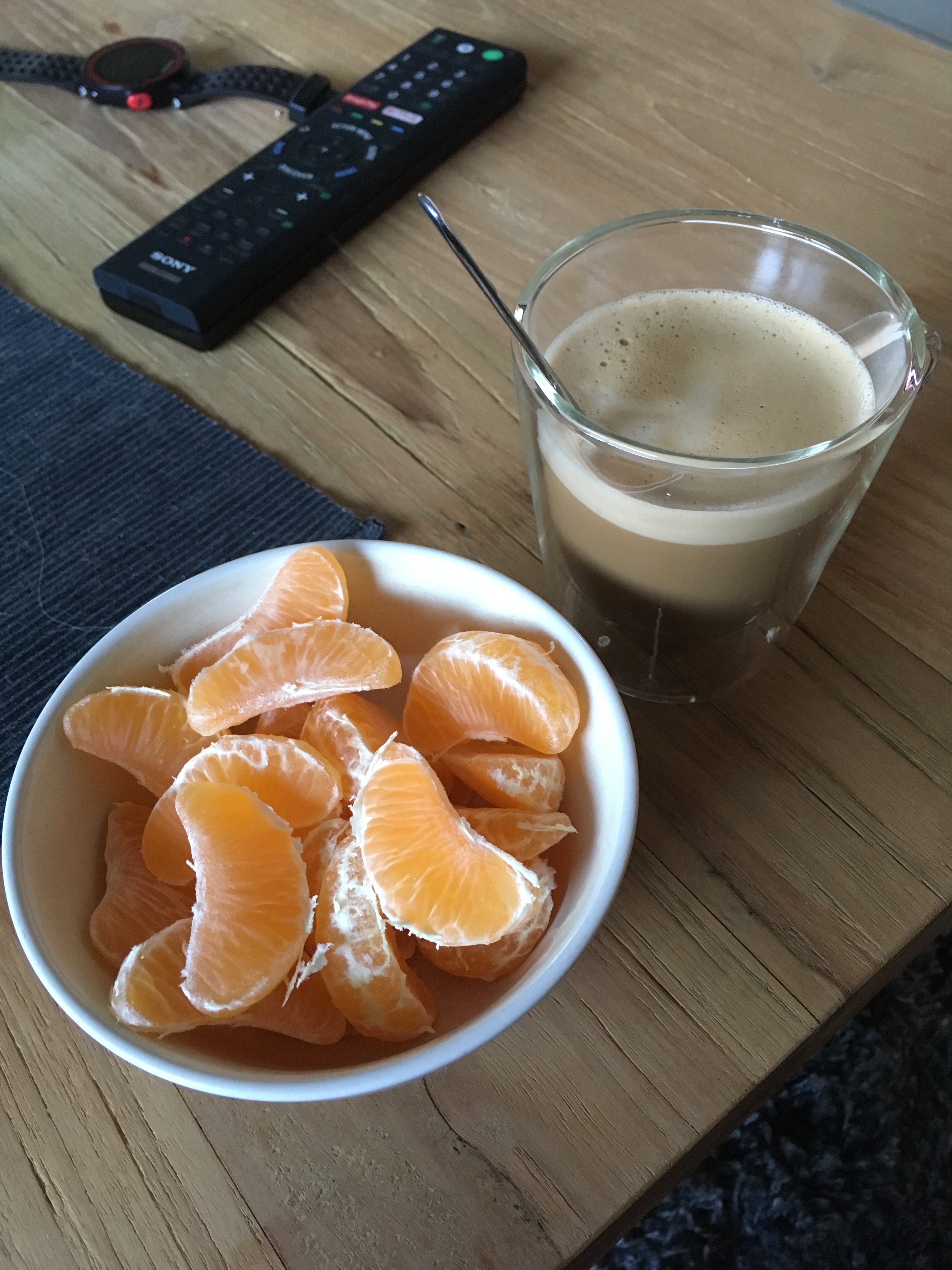 Mandarijn, komkommer, boterham ham en selderij, boterham boterhamworst en glas water. Jum