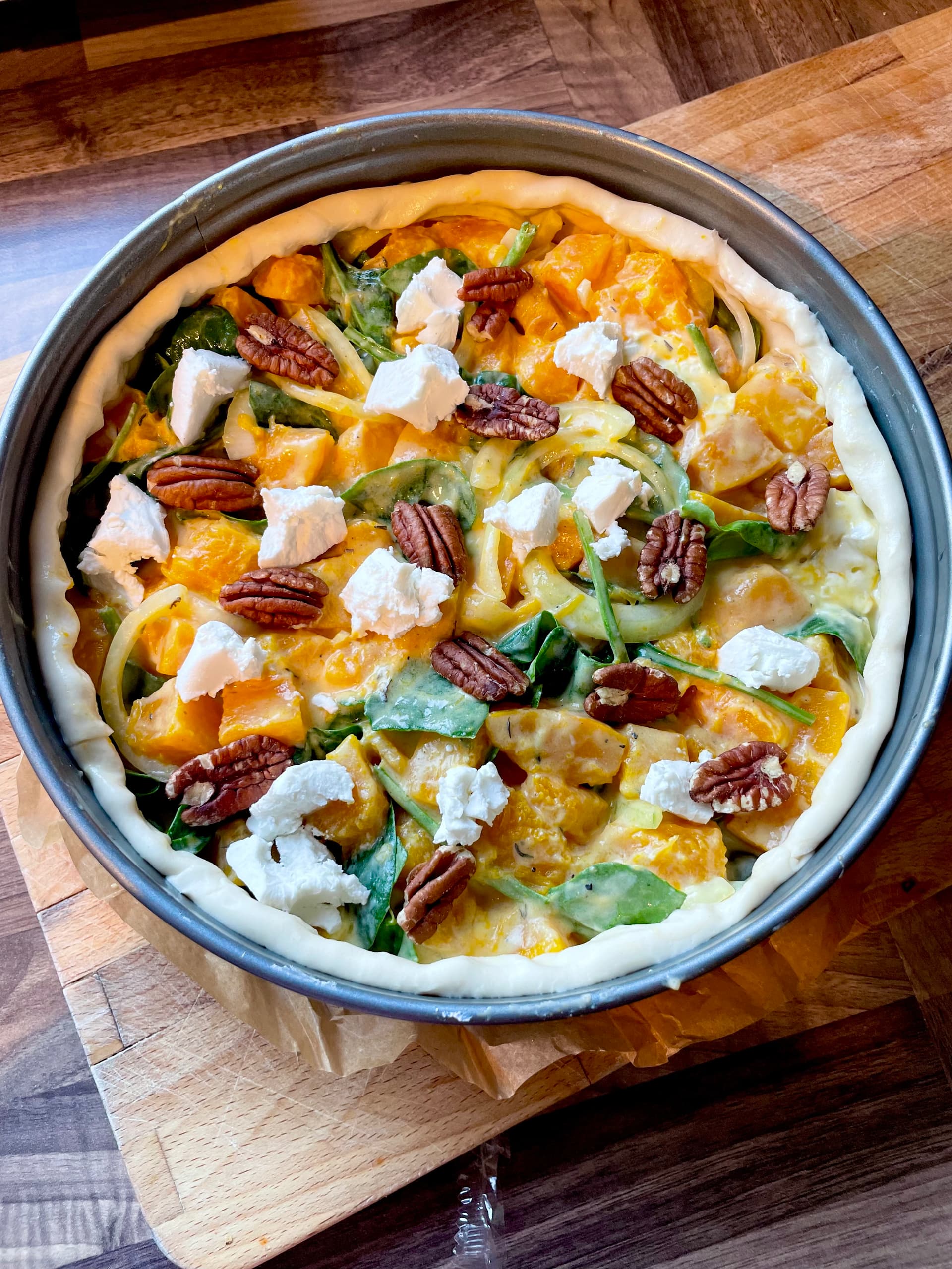 Hartige pompoentaart met spinazie en geitenkaas, hij moet nog in de oven maar ziet er nu al lekker uit!
