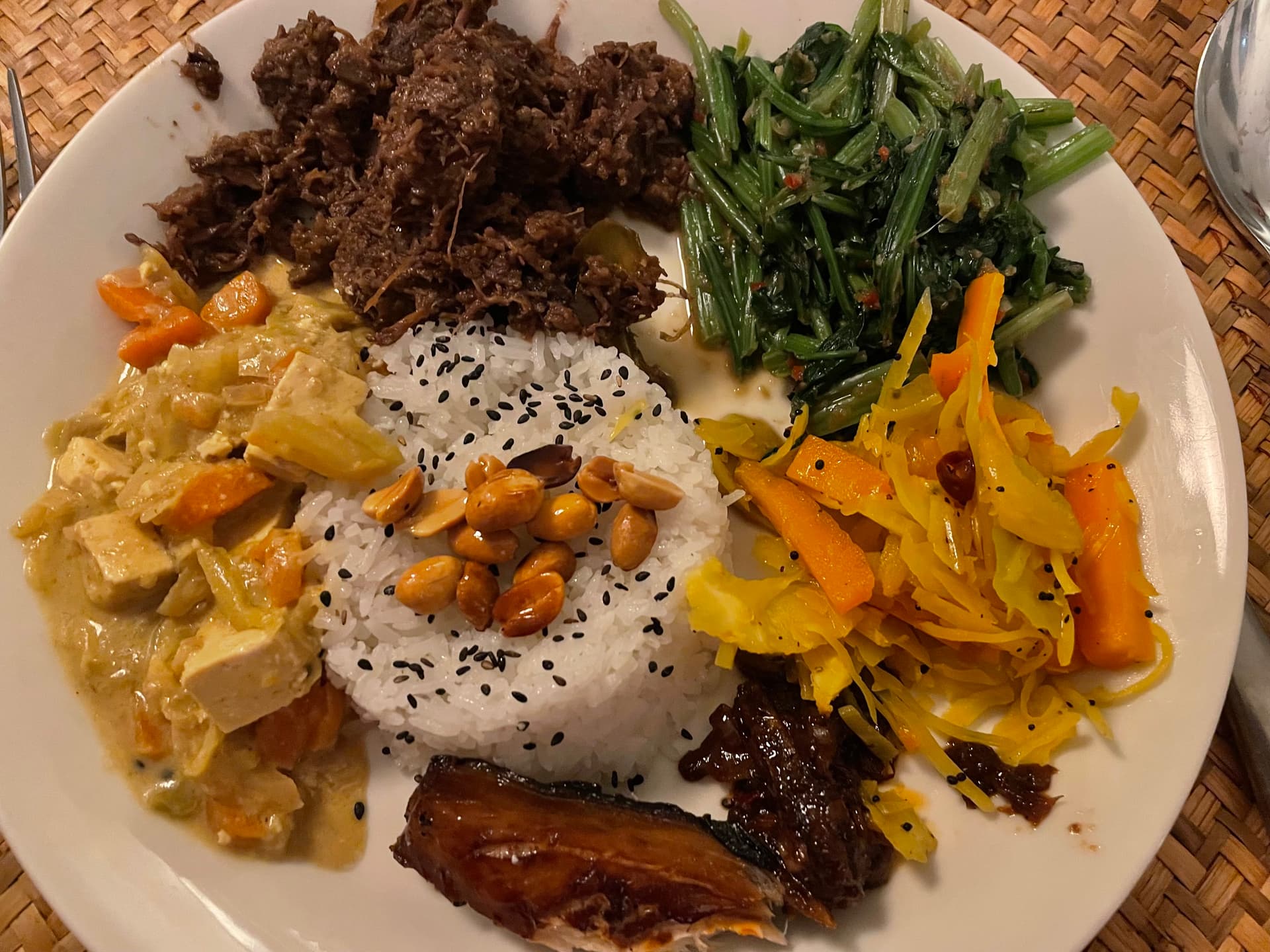lamssaté (not pictured), rendang, makreel met sambal ikan bilis (ansjovis-pinda sambal), sayur semak lodeh, kankung belacan (waterspinazie met trassi), koolsalade iets maar weet de naam niet