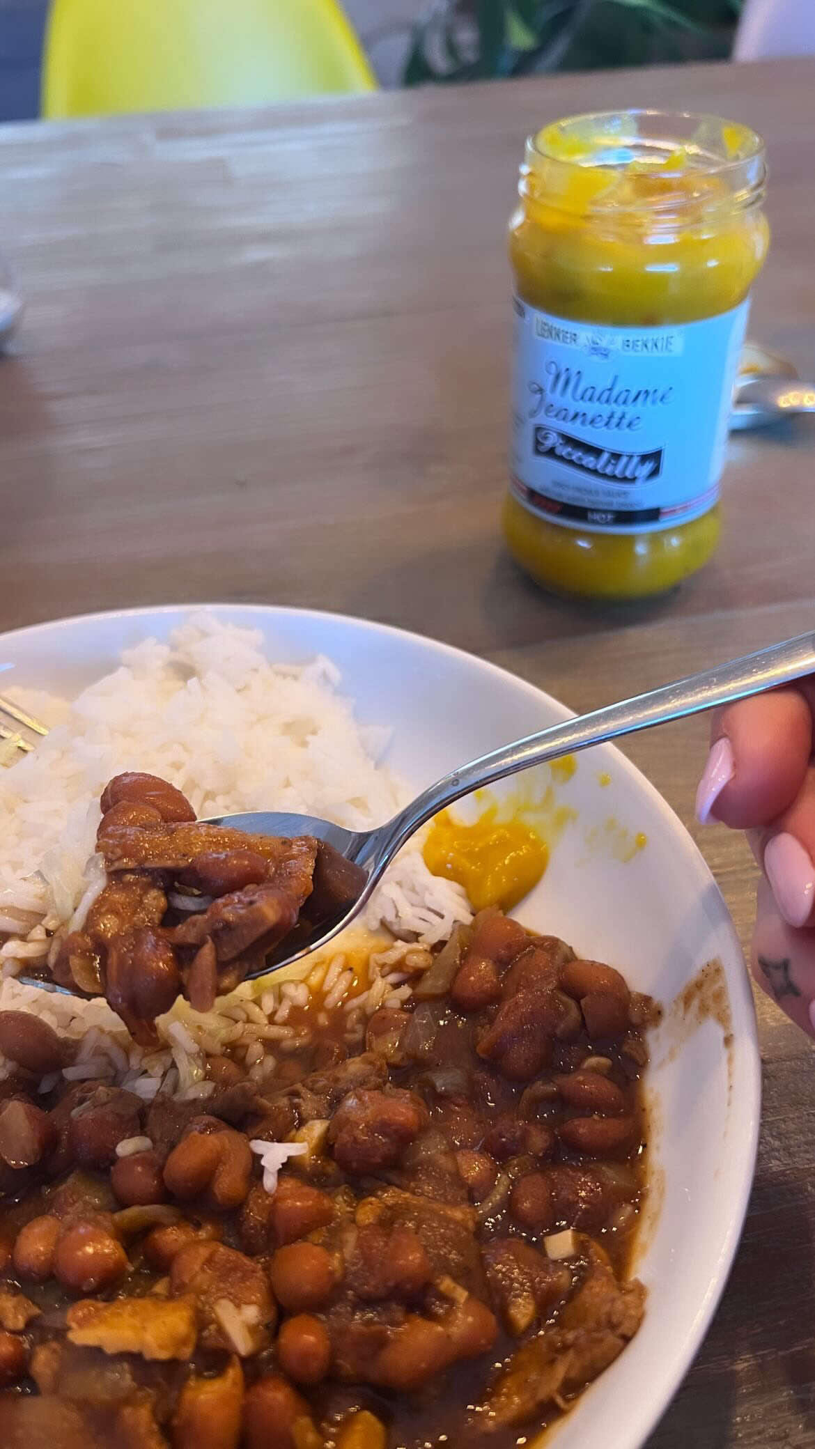 En half vega kip half tofu, want had ik beide nog. Vond de tofu ook wel goed erbij, misschien volgende keer apart marineren en in de airfryer. Vervolgens in de bonen, dan krijg je misschien wat aangebakken kipstructuur erin.