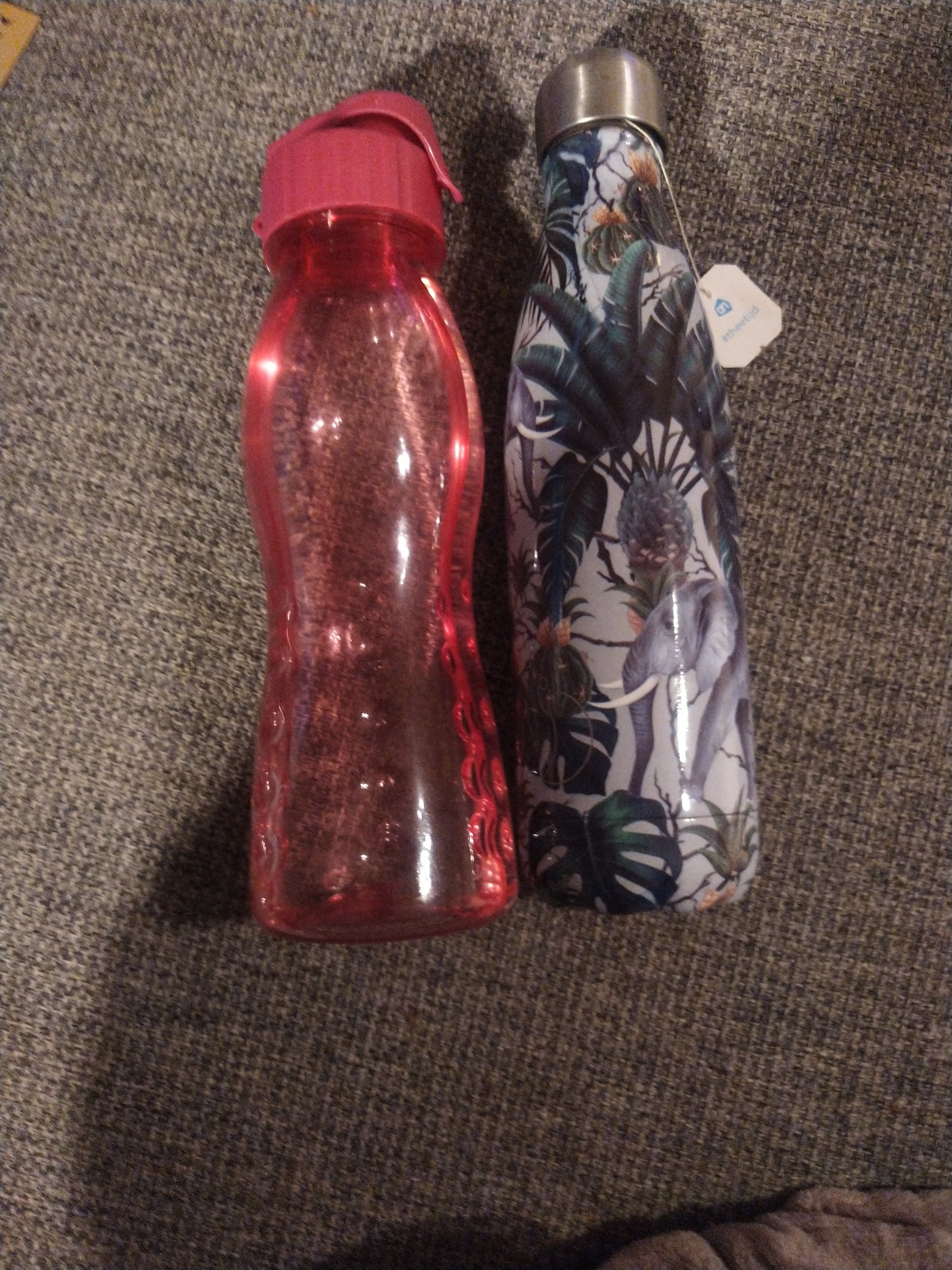 Of je nou nog half in slaap was of niet, ik vroeg laatst toen ik moest haasten of er in die roze waterfles dus ff water in kon worden gedaan en in die andere ernaast thee. Dan kon ik nog snel 3 min. Douchen hij dat in mn tas stoppen en snel weg. Want ik was al vrij gestresst om de tijd. Maar toen ik mn tas opende kwam ik erachter dat in die roze plastic fles thee zat en in die rechter water. Ik snap het nog steeds niet.