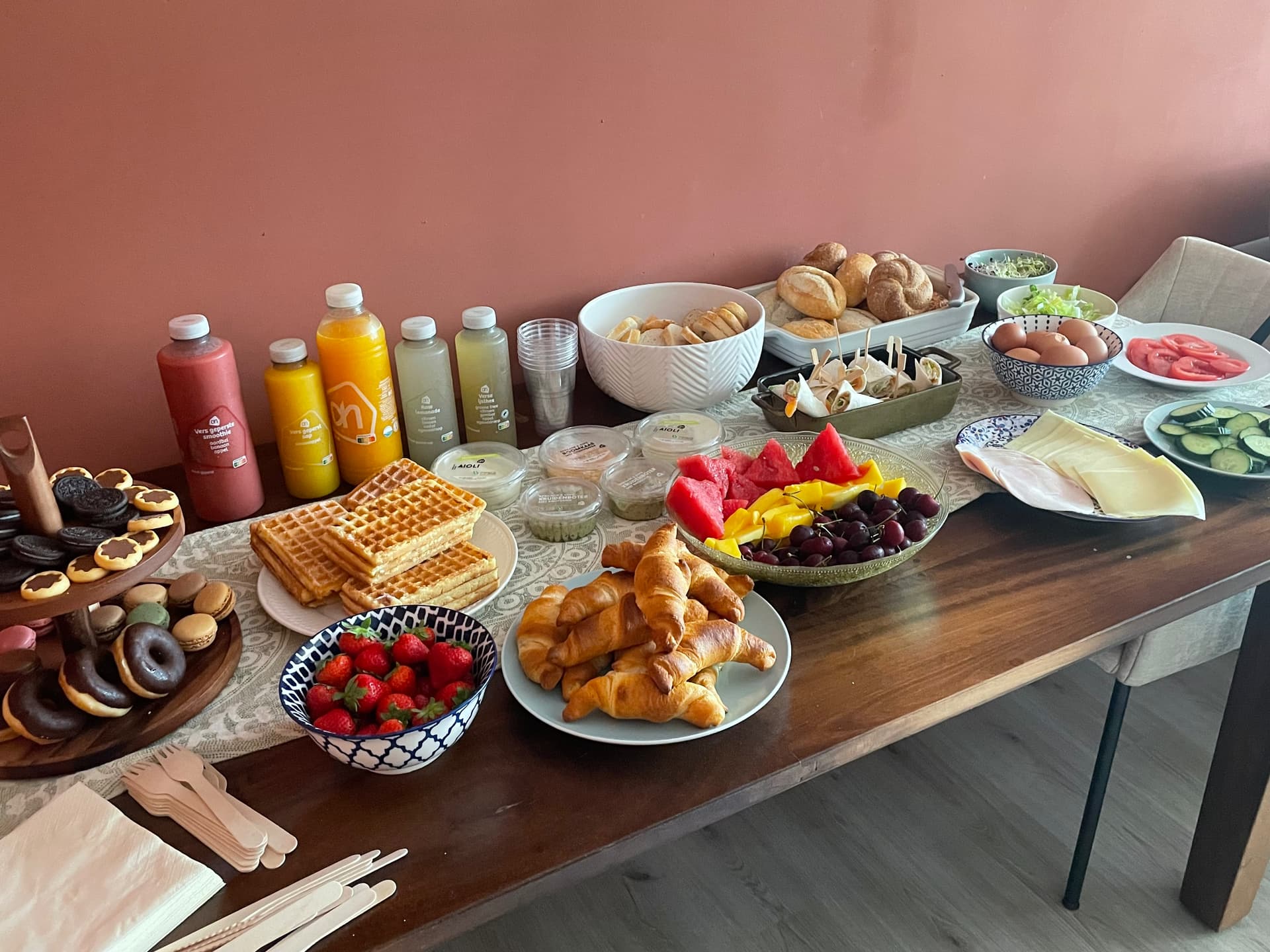 Maar wel verse croissantjes, eitjes, verse broodjes met kaas kipfilet komkommer tomaat en kiemgroenten. Fruit (kersen, aardbeien, mango en watermeloen). Wafels met slagroom en aardbeien. Donuts, macarons en koekjes. Wraps met zalm en roomkaas. Stokbrood en dips. Sapjes.