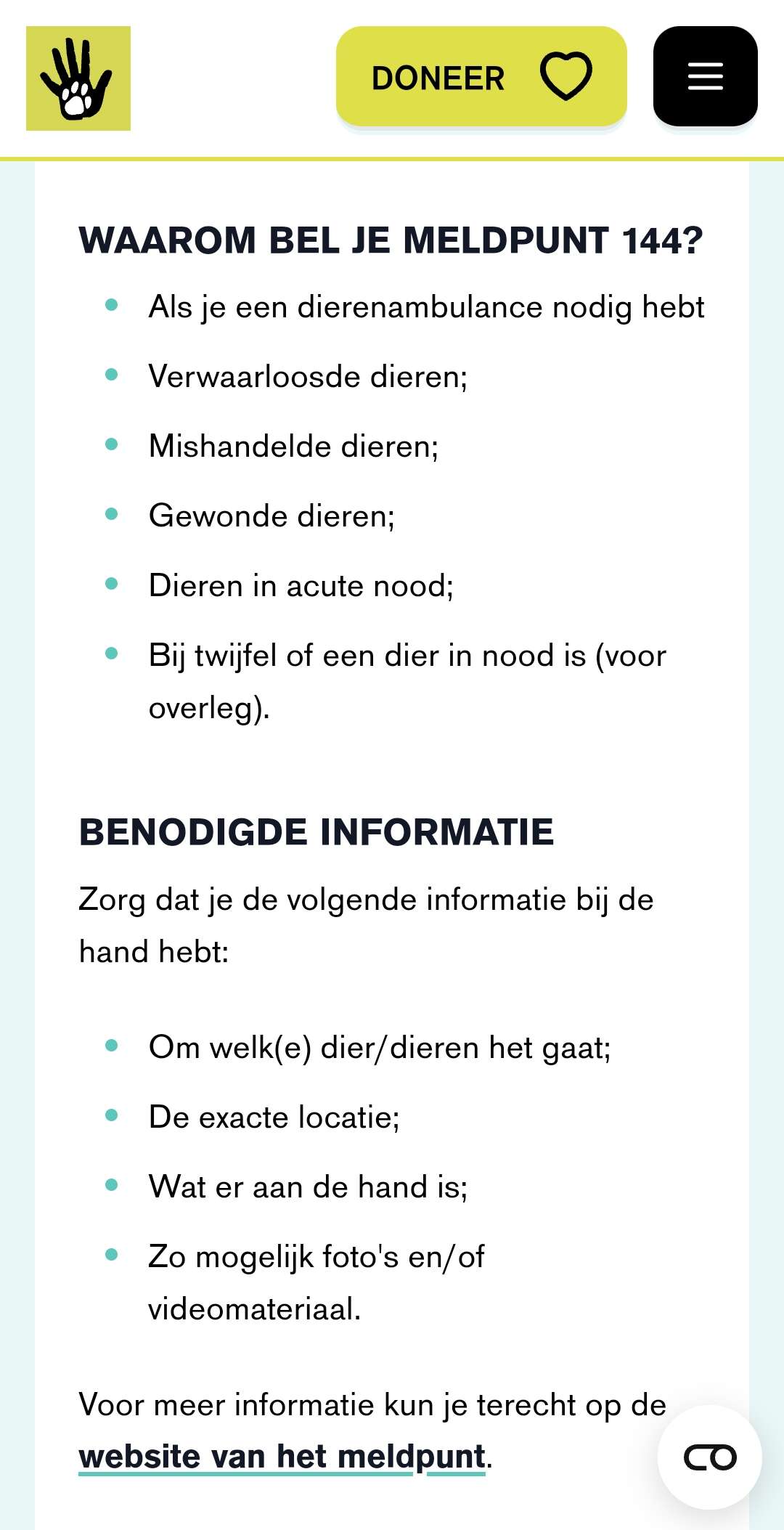 Edit: even bijgevoegd voor als iemand een keer een melding wil maken. De slogan is ook mn favo ezelsbruggetje om het te onthouden: 144, red een dier.