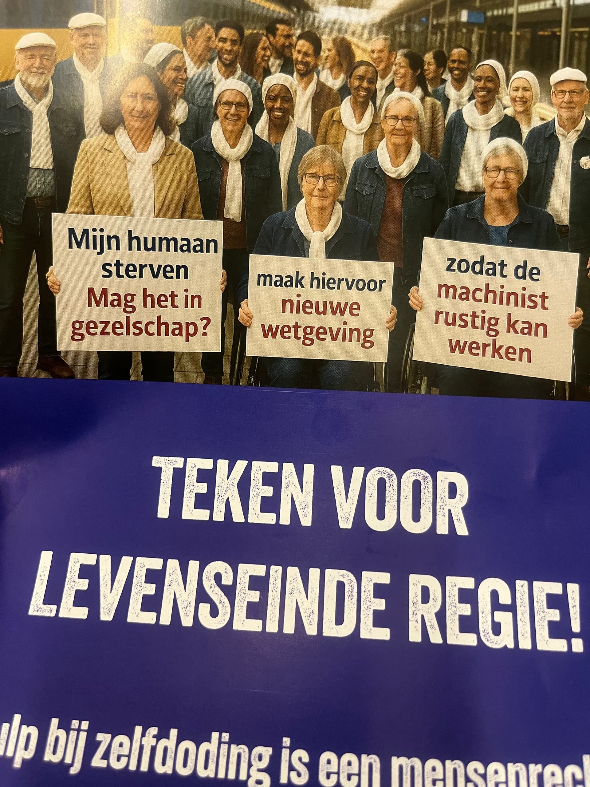 Ik liep op Utrecht Centraal en zag allemaal ouderen in het wit en het leek een actie voor het ouderenfonds. Ik steun dat. Maar toen ik met een van hen sprak bleek het om de euthanasiewet die zij willen verbreden te gaan en of ik wilde tekenen. Toen moest ik huilen, omdat ik het niet verwachtte en het op dit moment een thema in mijn leven is.