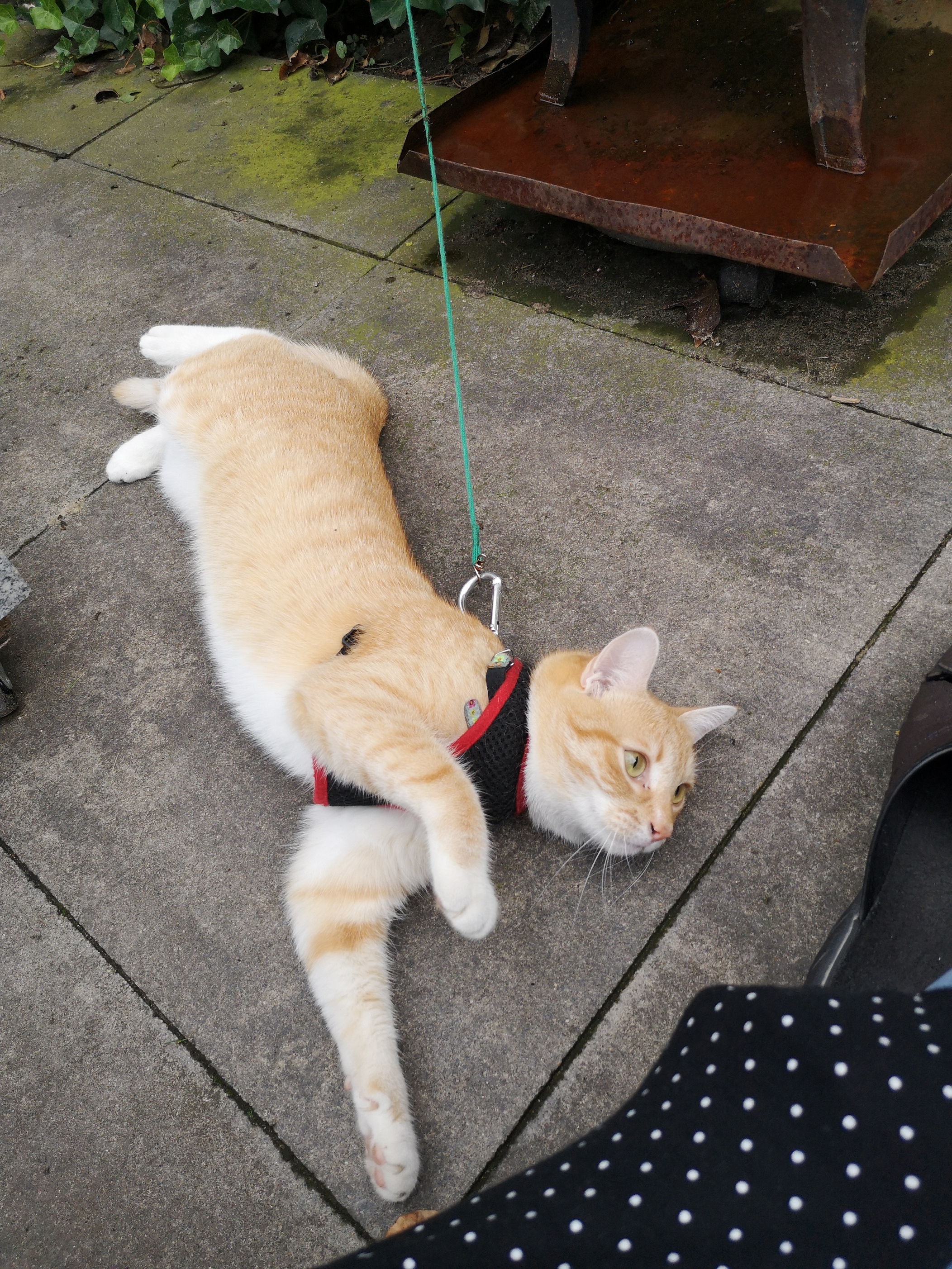 Onze buren hebben hun kat aan een tuigje zitten maar nu is ie door de heg heen gekomen en nu