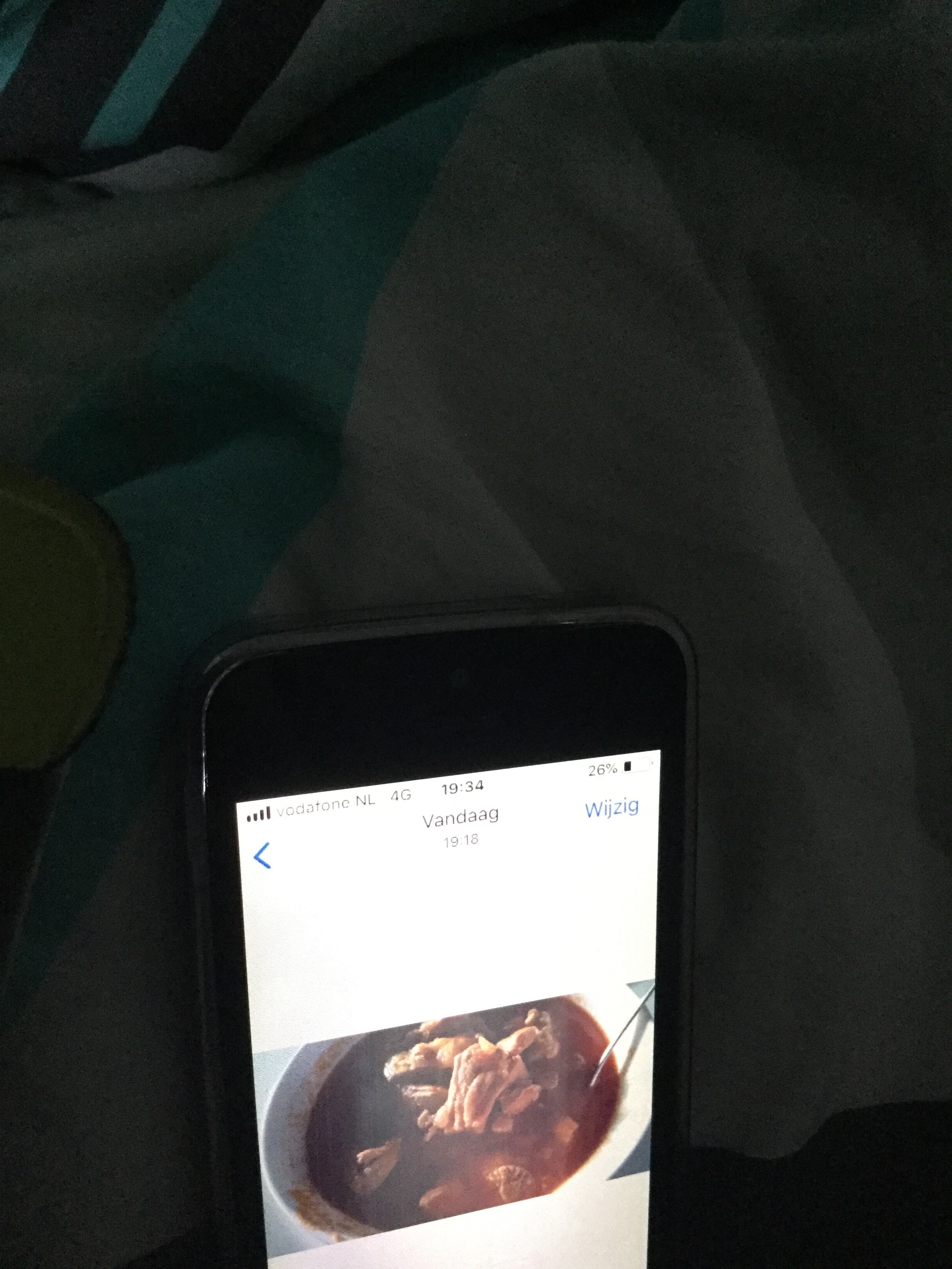 En iemand stuurt mij een foto van z’n avondeten, het ziet er echt smerig uit. Lijkt op gebakken ingewanden in een plas bloed. Nou weet ik dat hij juist wel goed kan koken maar ik voel me de afgelopen week al de hele tijd behoorlijk slecht/ziekig en die foto kan ik niet aanzien. Ik moet er echt ff van bijkomen want ik ga zowat over m’n nek. Wat is dat joh. Ik wil nu niet weer mn whatsapp openen.