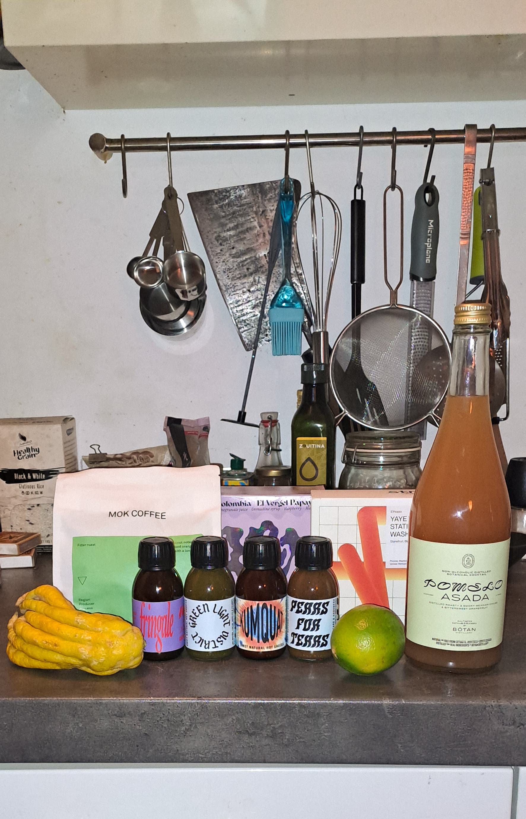 4x hot sauce van Swet (vlnr met ansjovis + olijf, venkel + appel, kumquat en peer), 3x koffiebonen, mocktail met gerookte pepers en grapefruit, en een bergamot en buddha’s hand