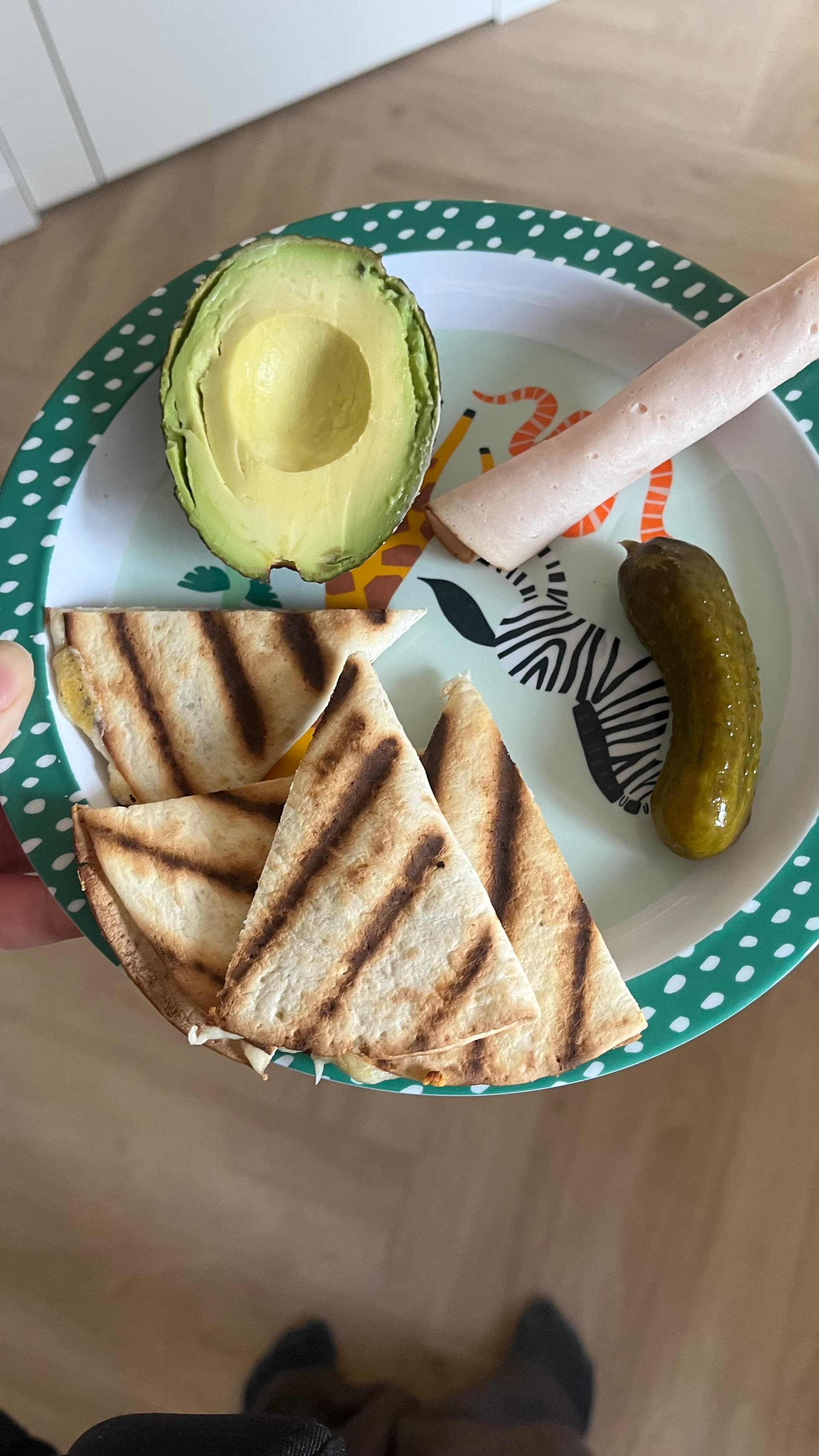 Zo random die augurk haha maar hij vindt het lekker. En een wrap met 30+ kaas. Plakje kipfilet (wil verder nooit warm vlees eten). At ook nog de boontjes uit de boontjes (ja heel specifiek