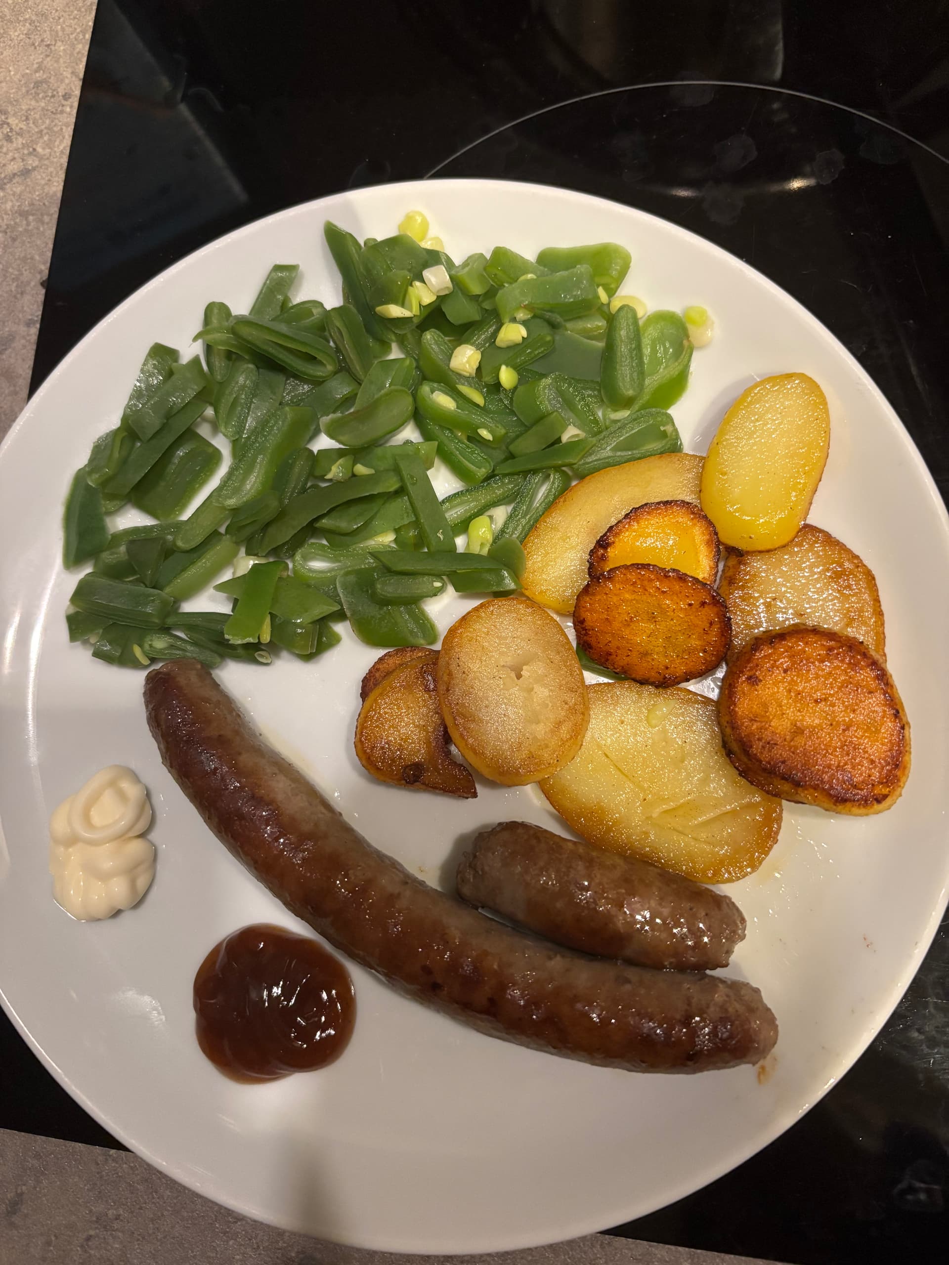 Die gekookte wortels (of erwtjes) gaan er hier ook goed in ja… met appelmoes ![]()