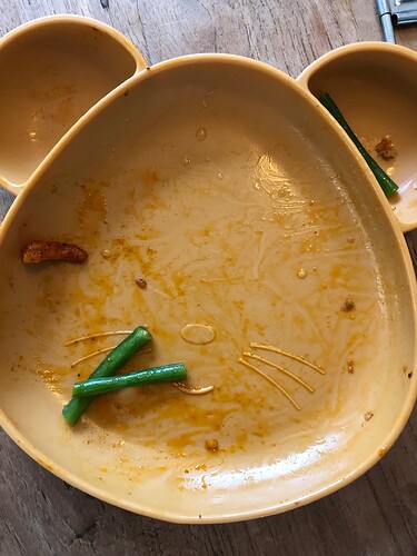 Tussendoortje op poezenbord was zga op, op een paar paprika reepjes na.