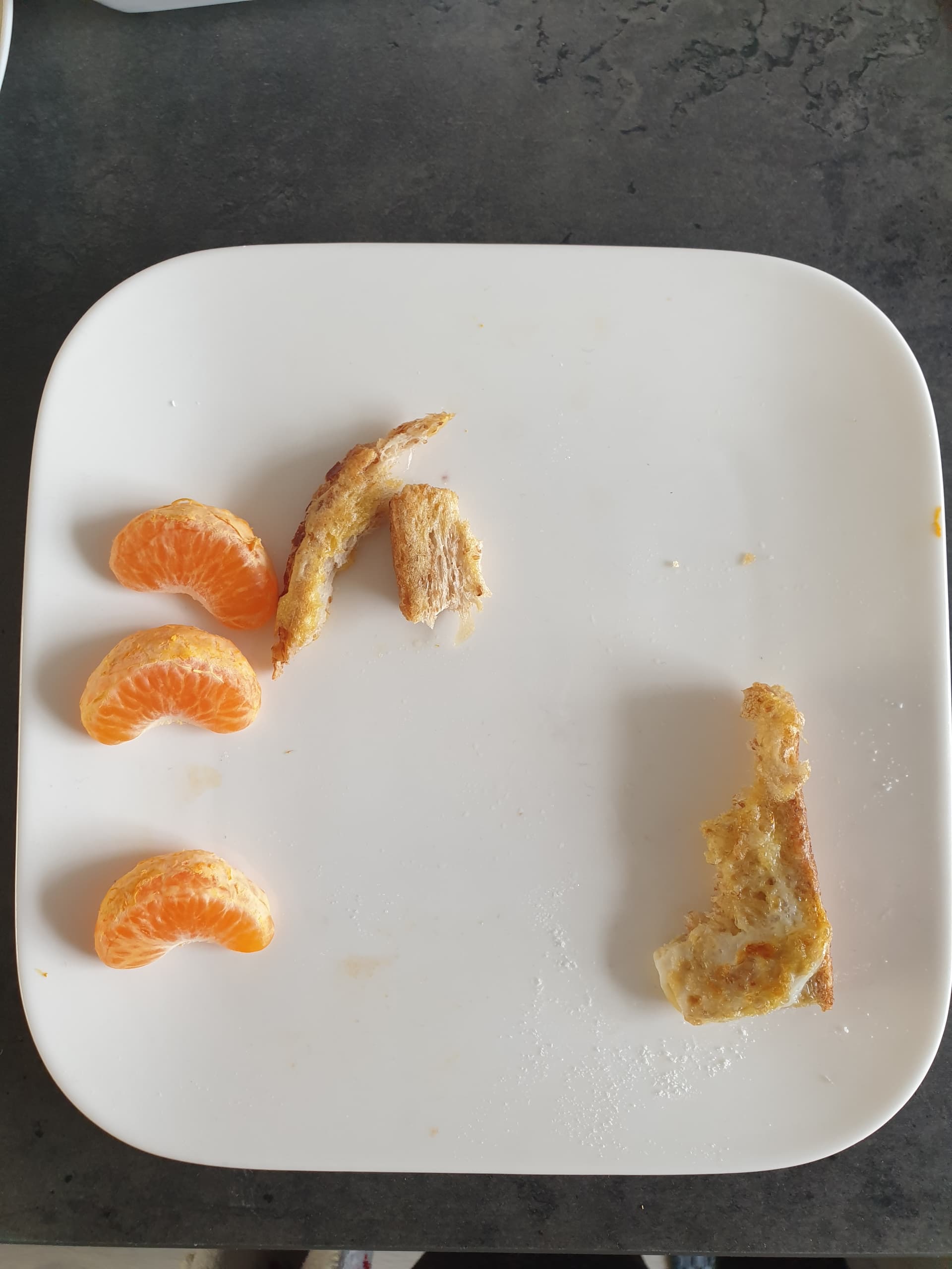 Ontbijt altijd met havermout (overnight oats) met kaneel en fruit, vaak druiven. Alleen op zaterdag krijgt ze bananenpannenkoekjes en met bijzondere dag zoals Pasen hebben we vaak iets van croissantjes of afbakbroodjes. Havermout gaat er wisselend in. Meestal wel de helft, soms eet ze een heel bakje op.