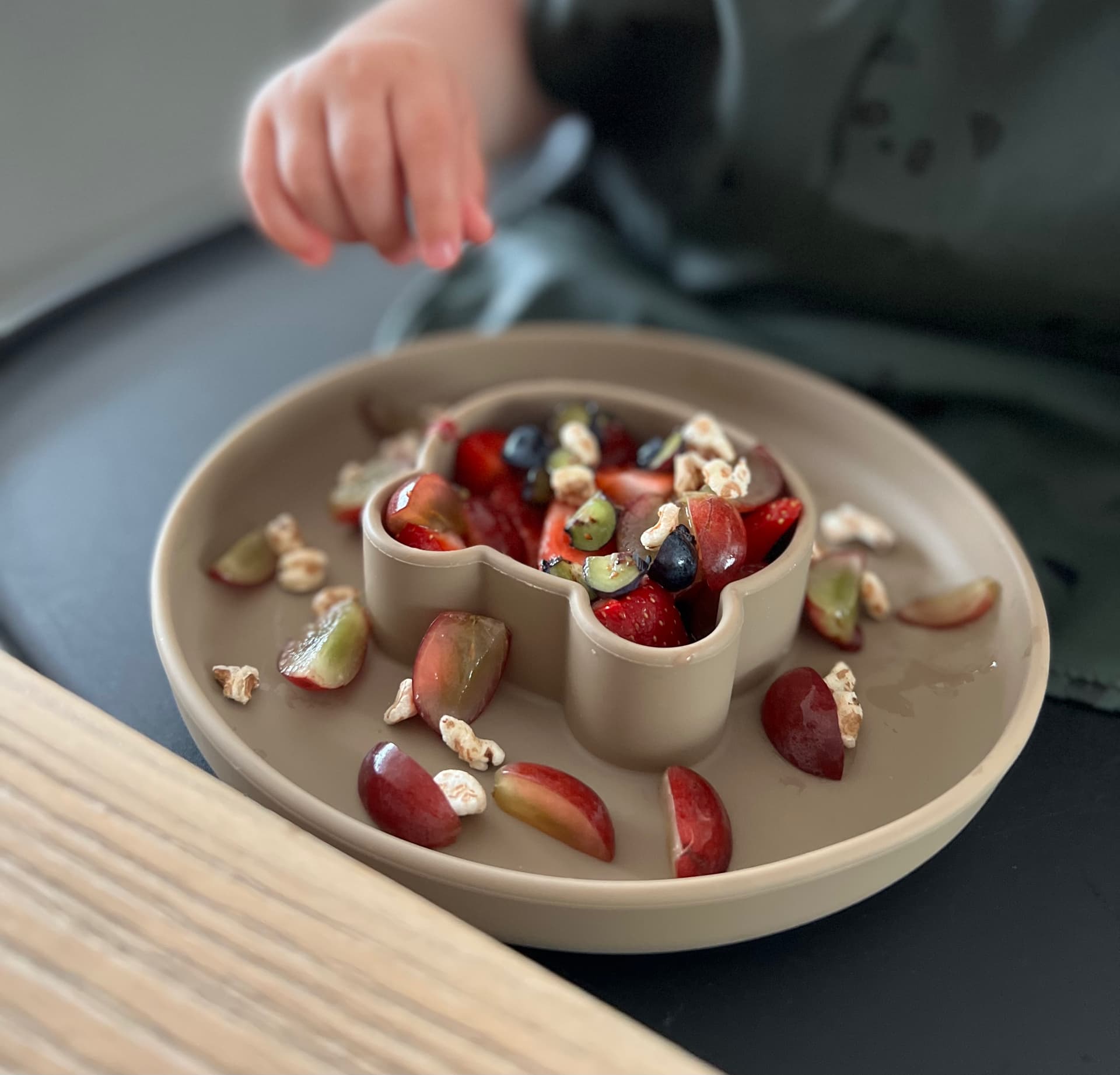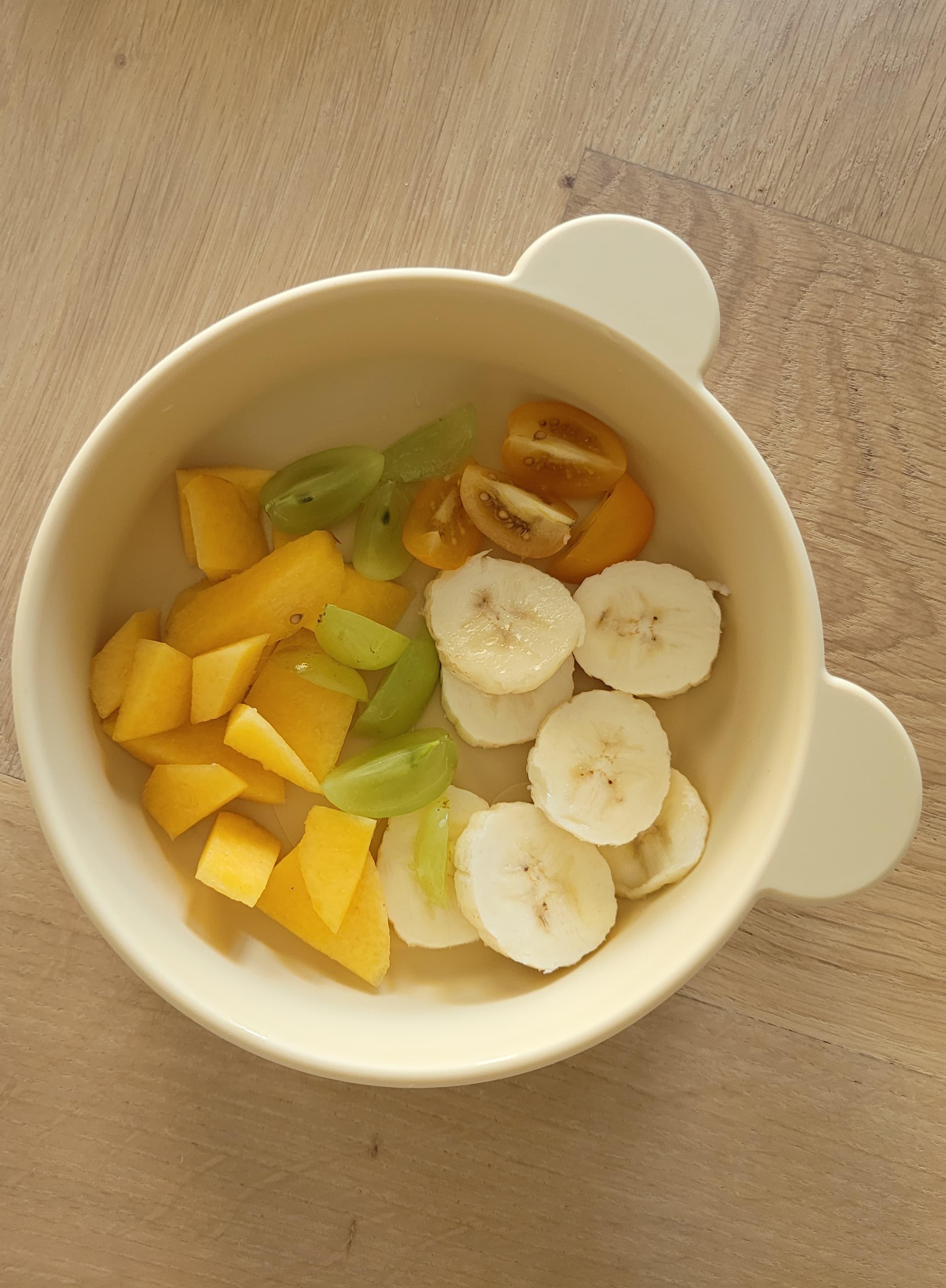 Als tussendoortje een bordje fruit en een geel cherrytomaatje.