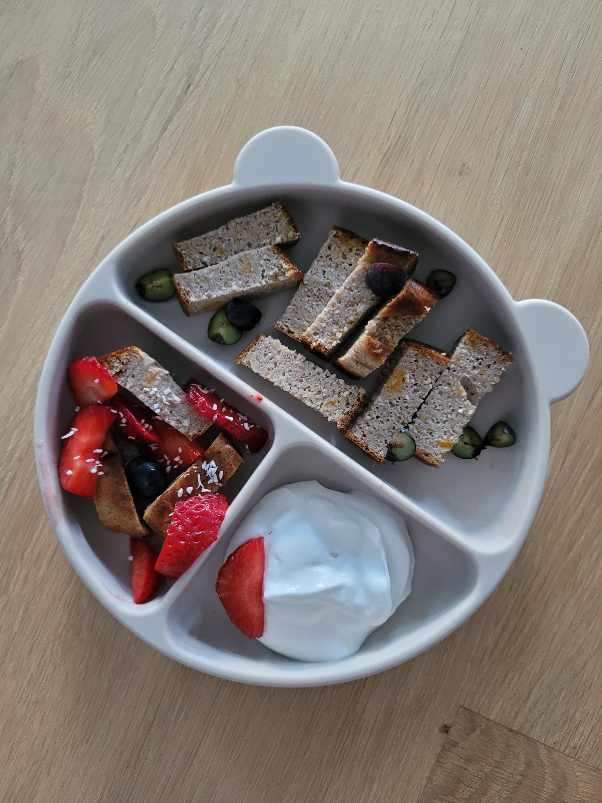 Als ontbijt pompoen-bananenbrood met kokosyoghurt en wat aardbeien en blauwe bessen