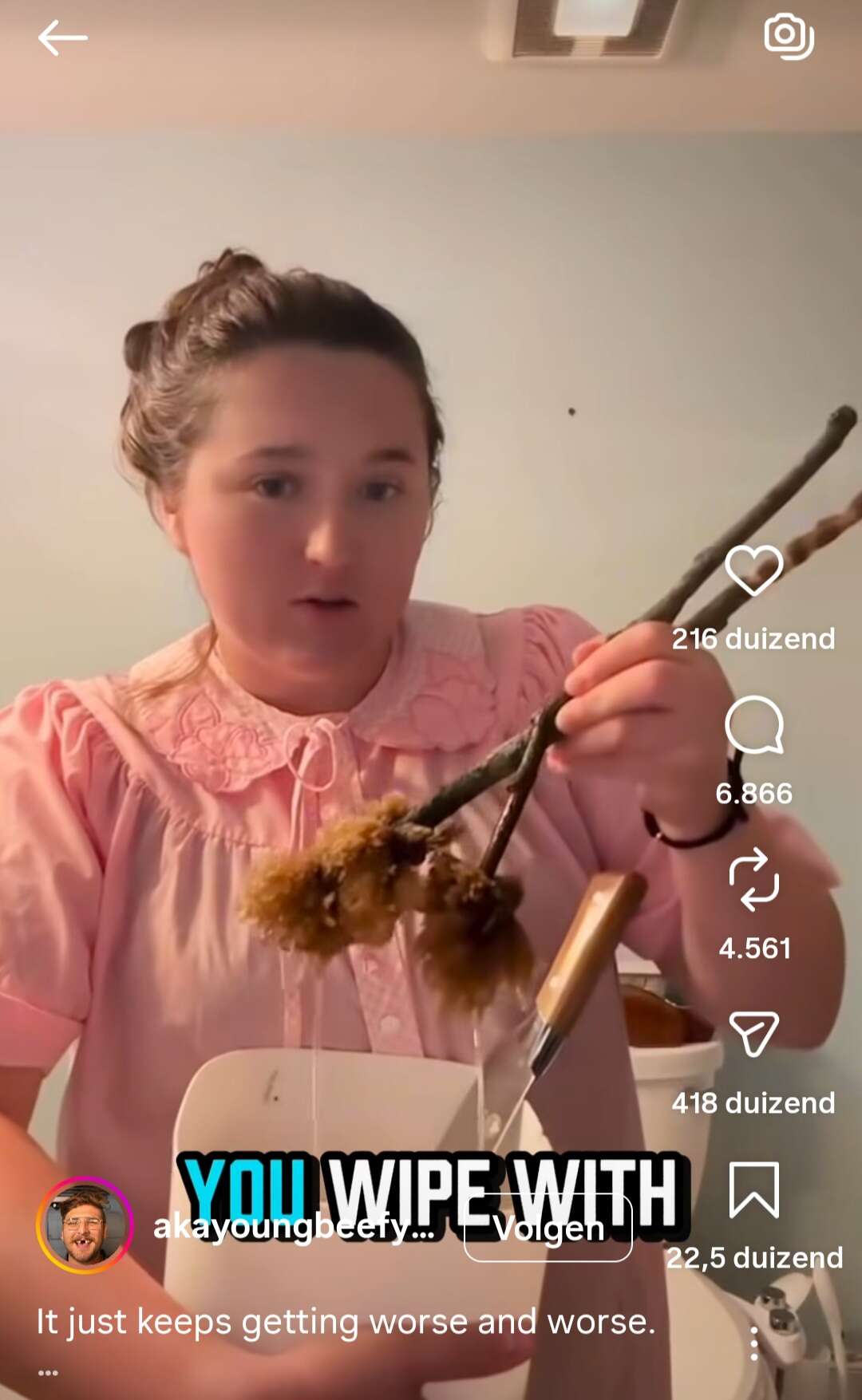 Is dit dat account dat ook een emmer water heeft met twee sponzen waarmee het hele gezin de reet wast, plus een poop knife, plus maar 1 keer per week de plee doortrekt? I sure hope so ![]()