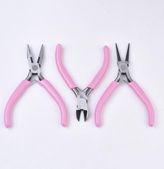 Ik heb RVS nietstiften en kettelstiften gekocht, maar het materiaal is een stuk dikker dan ik gewoon ben en die krijg ik moeilijk doorgeknipt en gebogen met mijn tangen (ik heb die typische roze):