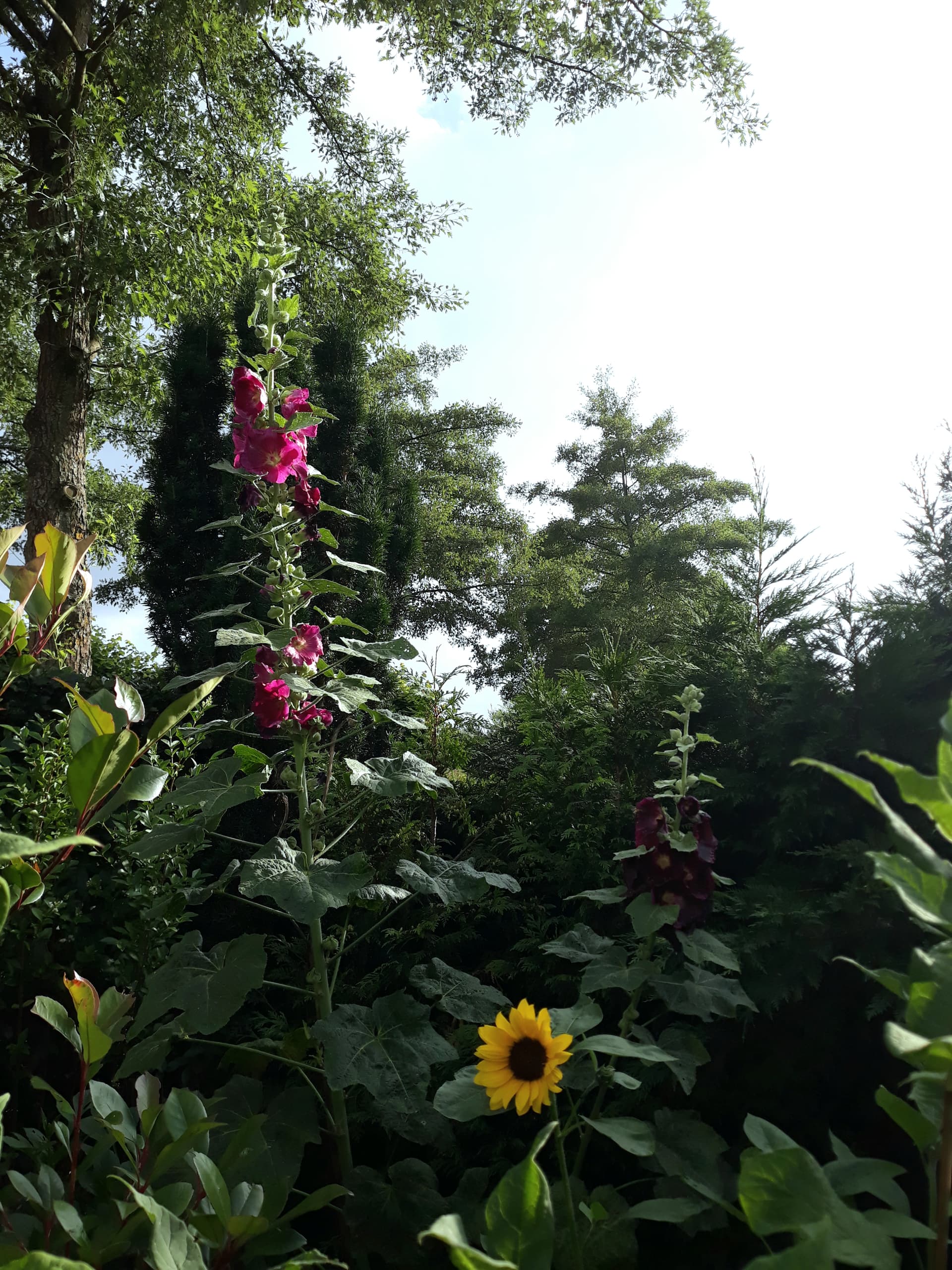 Kijk hoe goed jouw stokrooszaden het in mijn tuin doen! Ze staan samen met zonnebloemen verspreid door heel mijn tuin, heel blij mee.